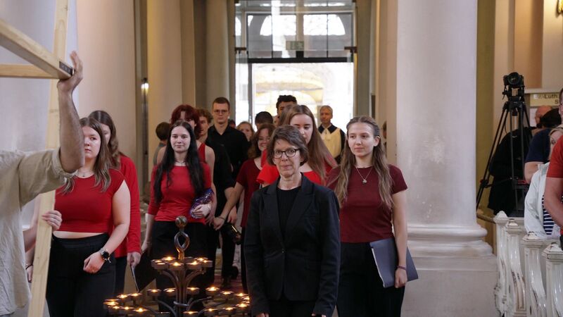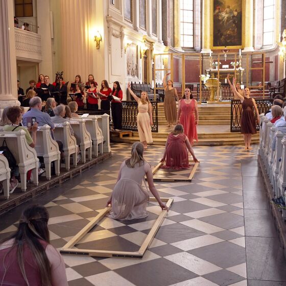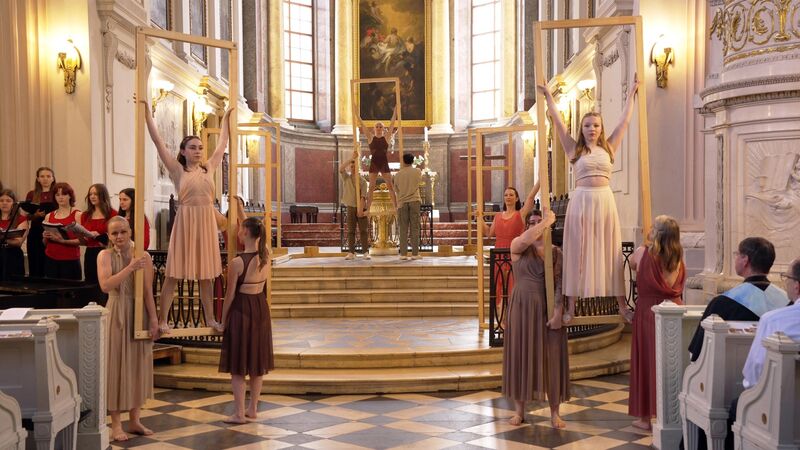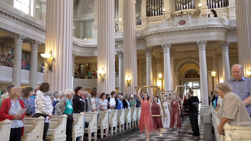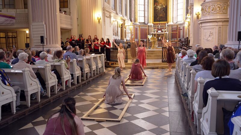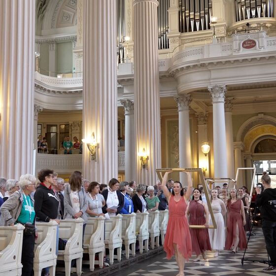 Der Chor wae eingeladen, den Eröffnungsgottesdienst in der Nikolaikirche am Samstag um 10.00 Uhr mitzugestalten. Mit ihren vier- und fünfstimmigen modernen Chorarrangements verliehen sie dem Gottesdienst einen liturgischen Rahmen. Im Mittelpunkt stand darüber hinaus der Song ›Total Eclipse of the Heart‹ von Jim Steinman, der einen besonderen thematischen Akzent setzte. Ein riesiges Highlight war die Tanz-Performance, die von der Tanz- und Turnergruppe ›SCrebel Dance & Trix‹ zu allen Chorstücken im gesamten Chorraum dargeboten wurde. Beide Gruppen haben von Freitag bis Sonntag vor Ort die getrennt erarbeiten Ergebnisse in ganztägiger Arbeit zusammengesetzt. Diese spannende Begegnung von Chor- und Turngruppe in einem Gottesdienst war ein erstmaliges Ereignis in der Nikolaikirche.