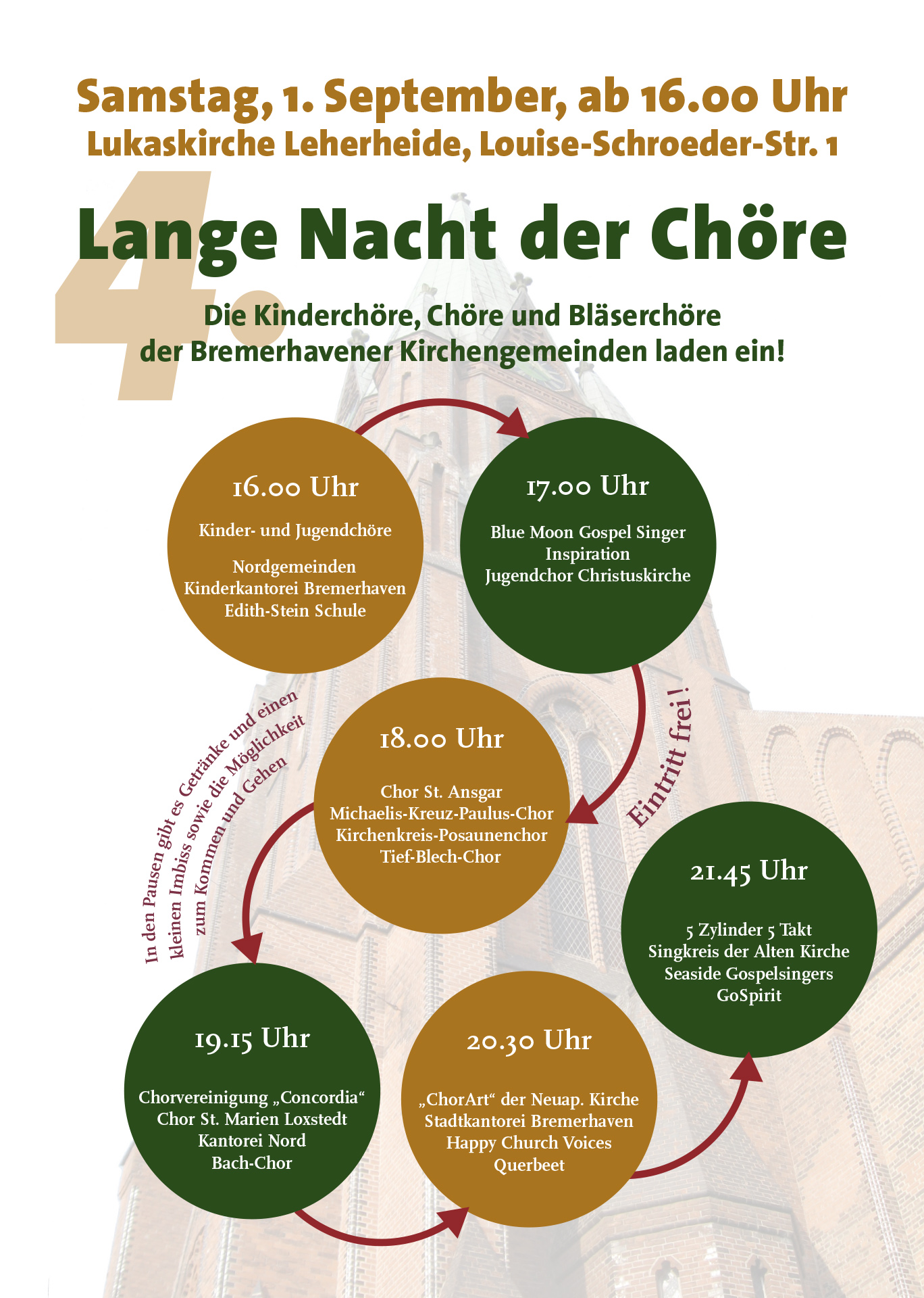 Samstag, den 1. September, ab 16.00 Uhr jeweils zur vollen Stunde 4. LANGE NACHT DER CHÖRE Eintritt frei! |