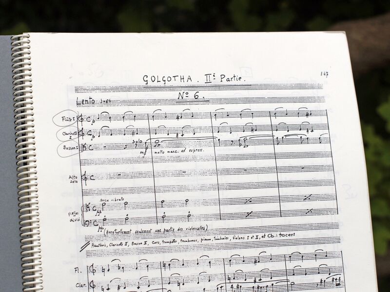 Der Schweizer Komponist Frank Martin, geboren 1890 in Genf, wurde 1945 durch die Radierung ›Die drei Kreuze‹ von Rembrandt mit ihrer faszinierenden Licht- und Schattenverteilung angeregt, ein Passionsoratorium zu schreiben. Nach einer ›Messe für zwei vierstimmige Chöre‹ von 1922 und ›In Terra Pax‹ von 1944 ist ›Golgatha‹ Martins drittes geistliches Werk. Er beschäftigte sich dazu mit den Passionen Bachs, die er schon als Kind kennen gelernt hatte: Eine Aufführung von Bachs Matthäuspassion hatte auf den Zehnjährigen einen unvergesslichen Eindruck gemacht. Das Oratorium ›Golgotha‹ entstand in den Jahren 1945 bis 1948 und ist zweiteilig angelegt. Uraufgeführt wurde es am 29. April 1949 in Genf in französischer Originalsprache.