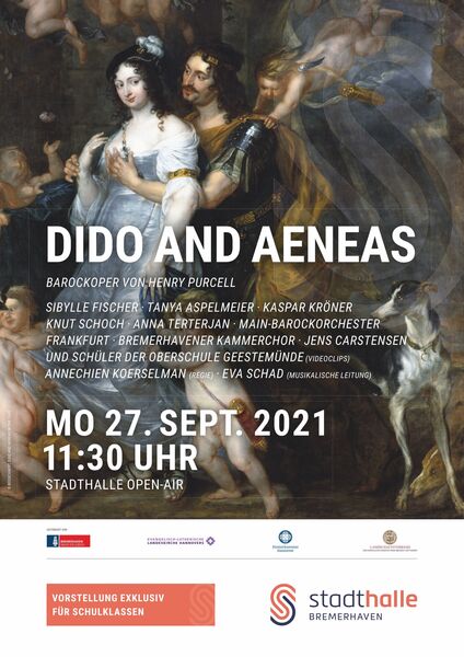 In einzigartige Musik hat Purcell diesen antiken Stoff gebannt und ein zeitloses Werk geschaffen, das auf dem Open-Air-Gelände der Stadthalle nun in einer besonderen Inszenierung aufgeführt wird: Das Main-Barockorchester Frankfurt ist spezialisiert für die Aufführung solcher Werke auf historischen Instrumenten, sodass Bremerhaven für einen Abend ins 17. Jahrhundert reist. Das exzellente Solisten-Ensemble sowie der Bremerhavener Kammerchor werden durch Schülerinnen und Schüler der Oberschule Geestemünde unterstützt, deren Beiträge über Video hinzugeschaltet werden und das Publikum wieder mit der Gegenwart verbinden.