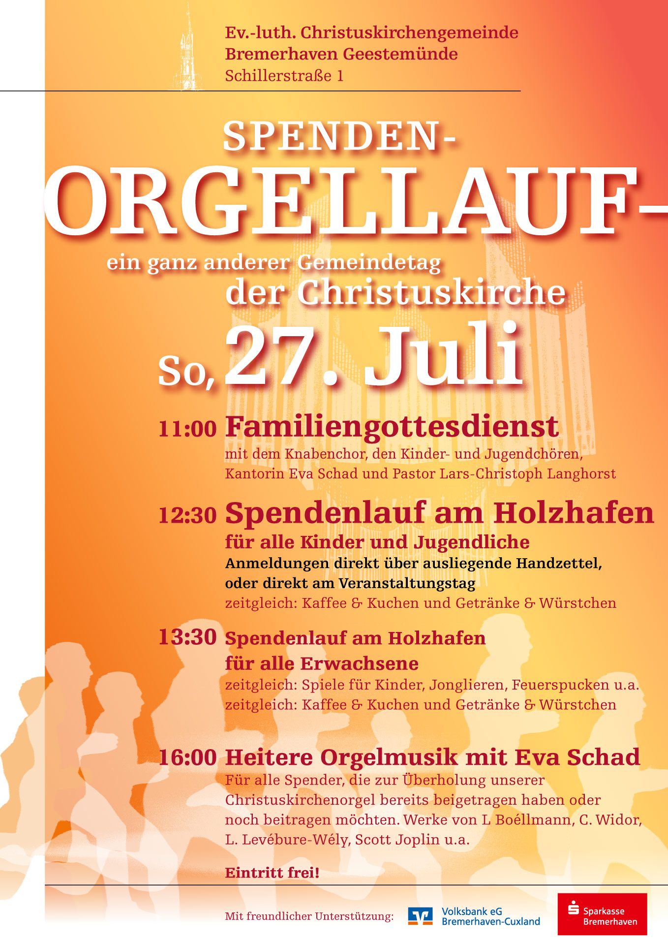 Auch für die, die ihre Sponsoren mit ihrer Lauffreude in die Verzweiflung getrieben hatten, war gesorgt: War das Geld der Angehörigen und Freunde ausgegeben, sprangen Großsponsoren wie die Geestemünder Buchhandlungen Huebener und Memminger, das Bestattungsunternehmen Koop, die Sparkasse, die Kleiderkammer und Decathlon ein. Die Volksbank schickte sogar sechs ihrer eigenen Läufer, die zusammen 411 Euro erliefen und hierfür 137 Runden um den Holzhafen drehten. Alleine über die Großsponsoren kamen so etwa 1600 der erlaufenen 3300,48 Euro zusammen. Das Orgelkonzert im Anschluss an den Spendenlauf brachte noch einmal 228 Euro für die Sanierung der Orgel ein.